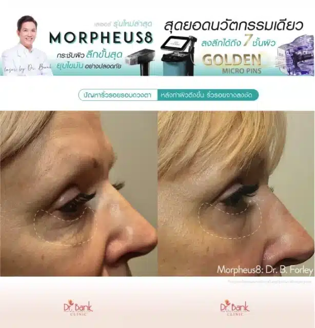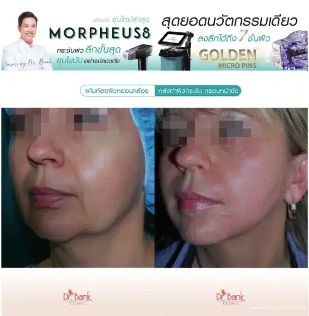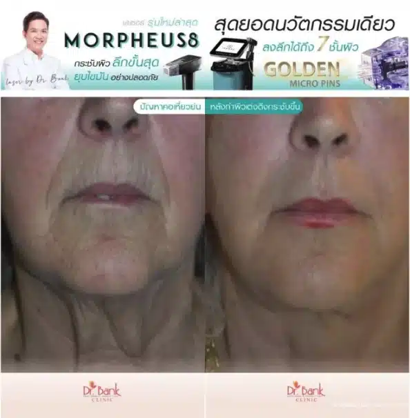 การเปรียบเทียบก่อนและหลังทำ Morpheus 8 ช่วยยกกระชับ และเพิ่มเรียบเนียนของผิว รวมถึงการลดเลือนริ้วรอยที่เกิดขึ้น